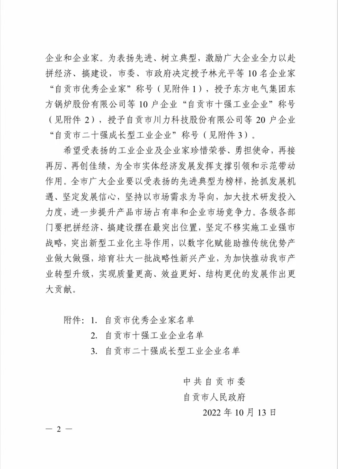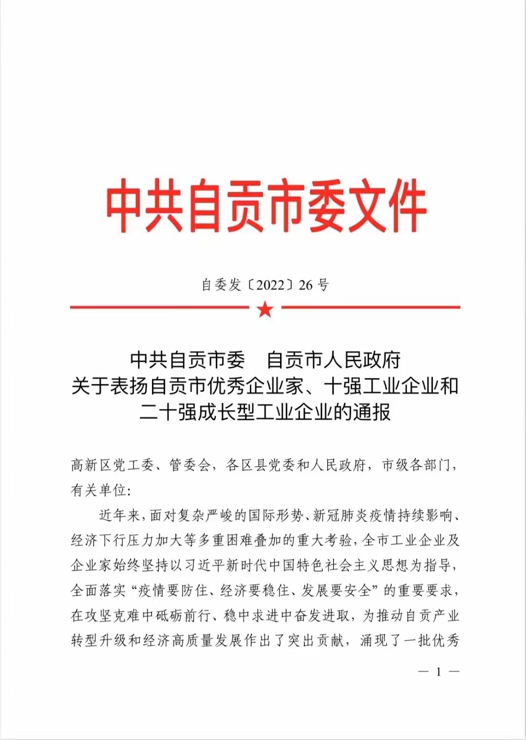 【概要描述】熱烈祝賀我公司榮獲自貢市“二十強成長型工業(yè)企業(yè)”稱號